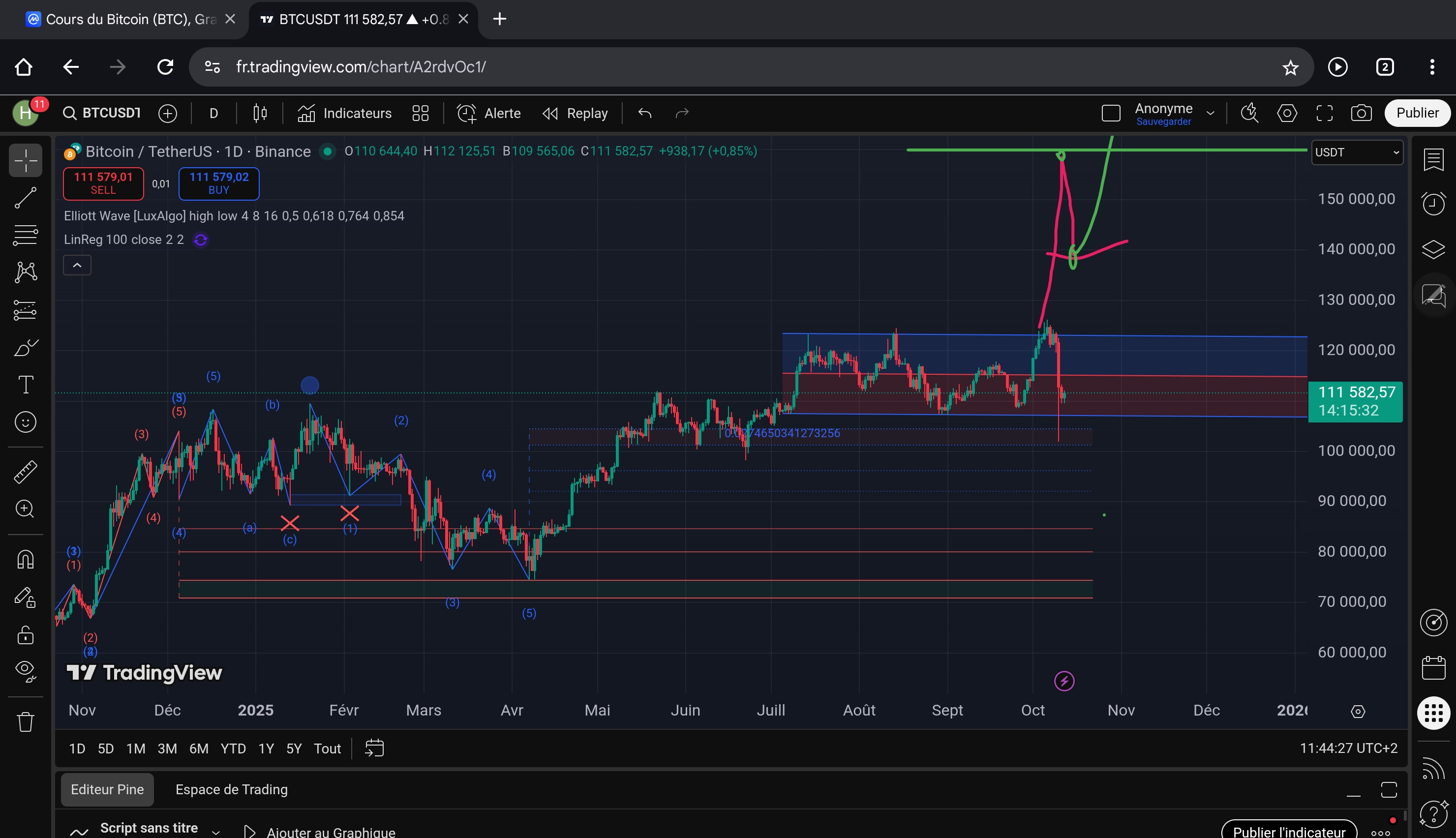 C’est le scénario optimiste, celui que j’ai tracé en vert sur le graphique. Pour moi, cette baisse est une correction saine et nécessaire avant la prochaine étape de la hausse.