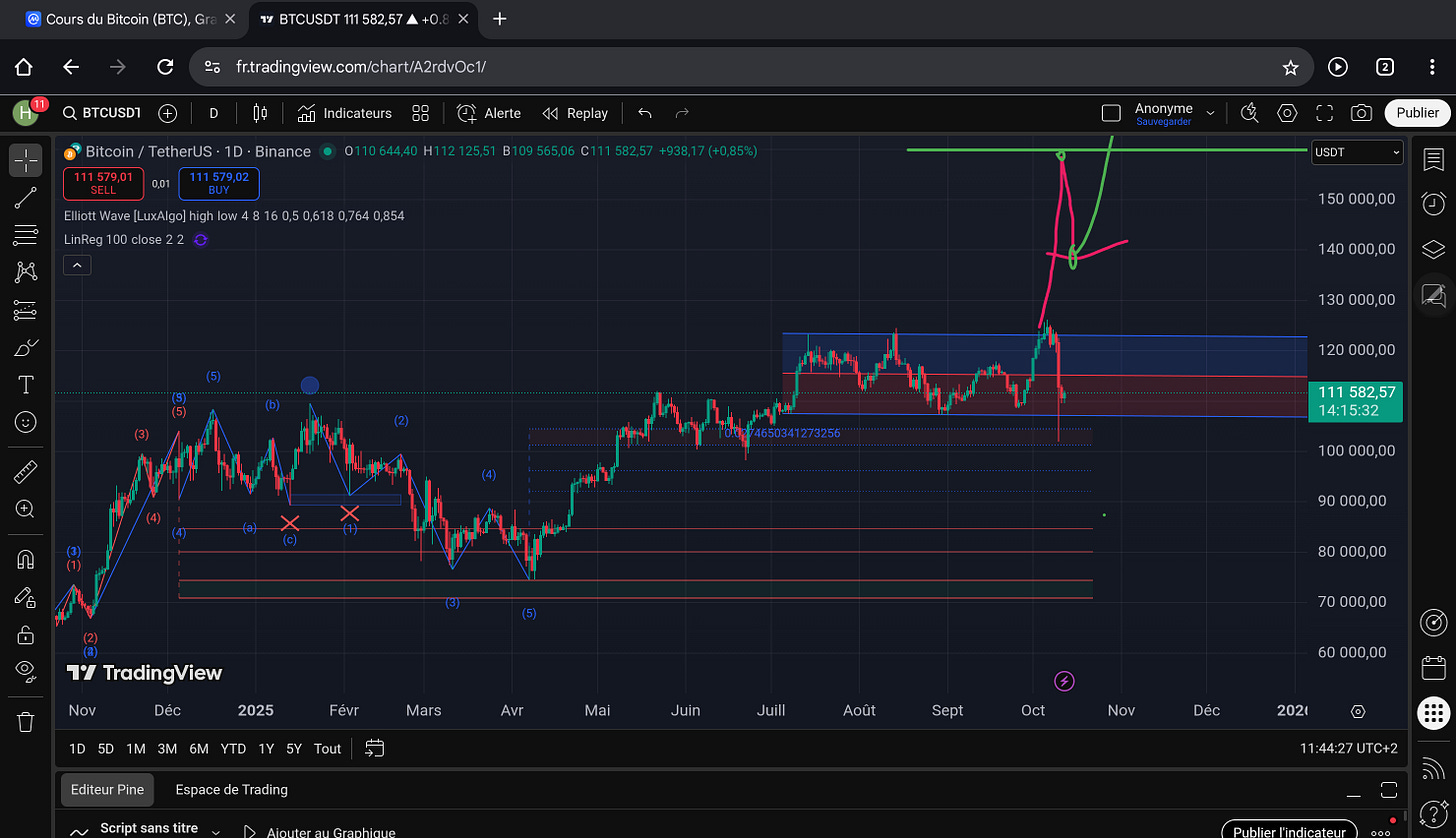 Dans ce scénario, cette zone agit comme un véritable trampoline. Le prix y trouve la force nécessaire pour rebondir, casser avec conviction l’ancienne résistance des 125 000 $ (la boîte bleue), pour finalement s’envoler vers de nouveaux sommets historiques. L’objectif que j’ai esquissé se situe autour des 155 000 $. Ce serait la suite logique de la tendance de fond qui reste, pour l’instant, haussière.