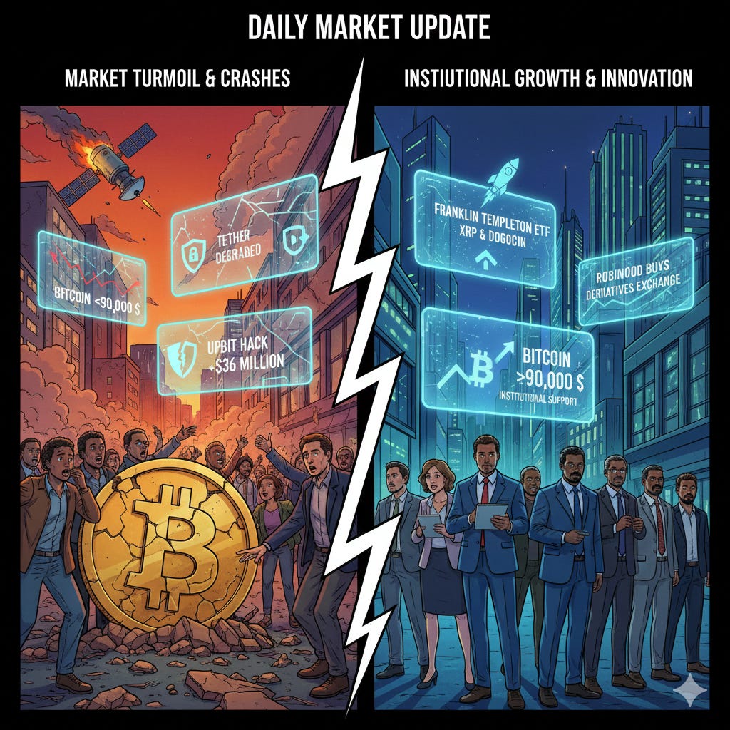 Le marché crypto respire ! Bitcoin retrouve les 90 000 $, soutenu par les institutions. Mais S&P dégrade le Stablecoin USDT de Tether, et un hack majeur frappe Upbit. Robinhood se positionne sur les dérivés, et la régulation mondiale s'accélère.