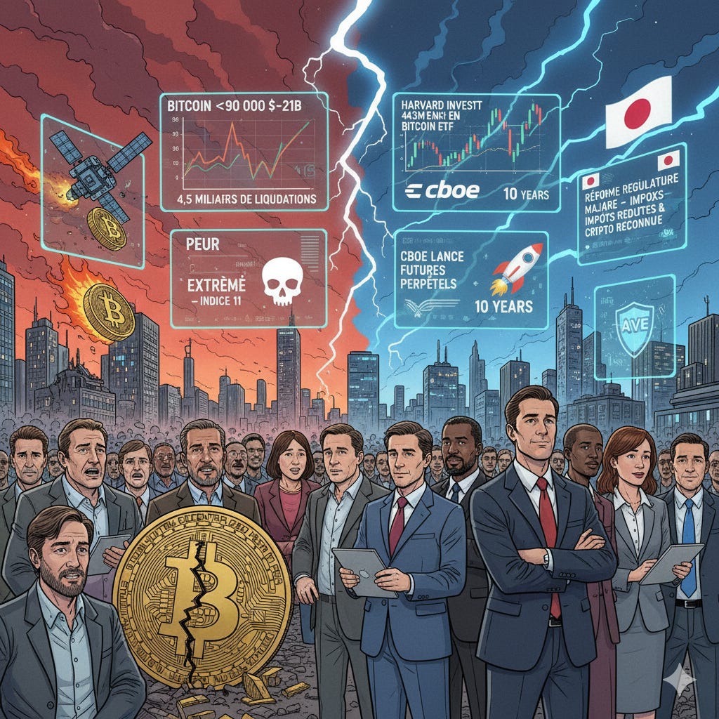 Bitcoin sous les 90 000 $ : Le Bitcoin est tombé sous les 90 000 $, un plus bas en six mois, effaçant les gains de 2025. Près de 4,5 milliards de dollars de liquidations hebdomadaires ont été enregistrées.