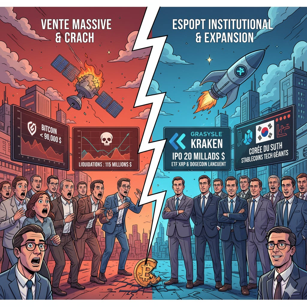 Cependant, l'intérêt institutionnel reste résilient avec l'IPO de Kraken, les lancements d'ETF XRP/Dogecoin, et l'accumulation continue des "whales". Les avancées technologiques (Avalanche Granite, ETF Solana avec staking) et les développements réglementaires (Corée du Sud autorise les Stablecoins technologiques) montrent un secteur en pleine maturation.