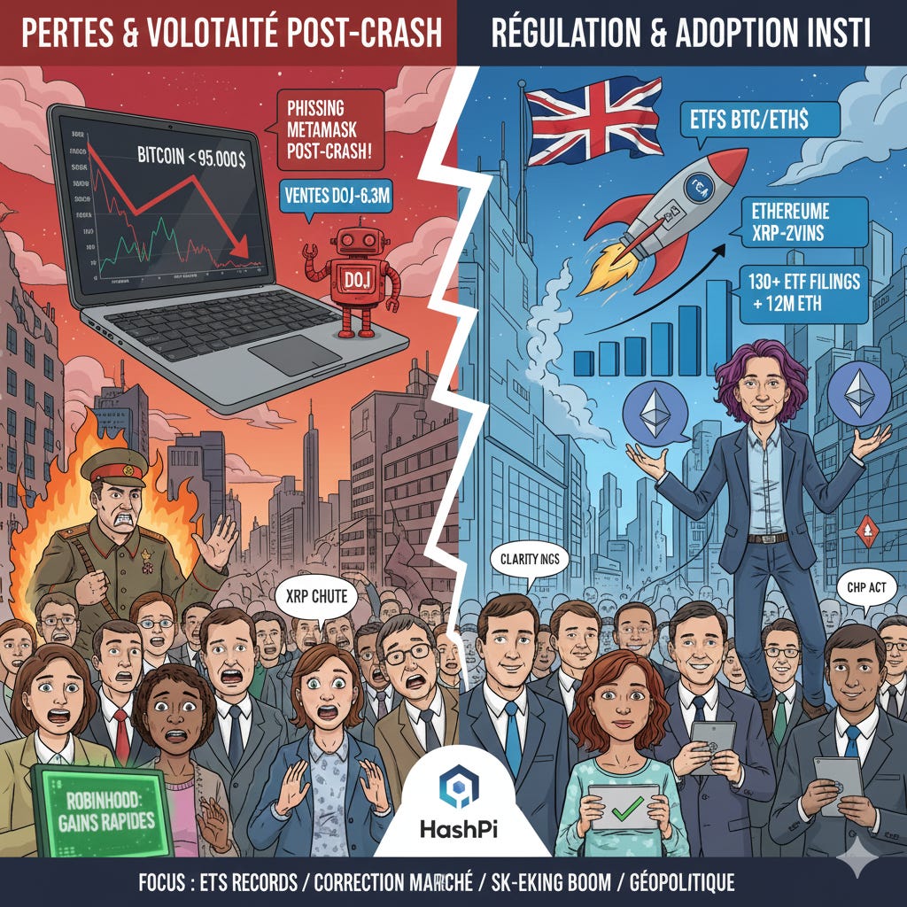Altcoins à la hausse : XRP et Solana ont largement surperformé Bitcoin et Ethereum en termes d’afflux institutionnels en 2025 (+500 % et +1000 %). Les Memecoins rebondissent (+65 % pour Pepe), mais avec un risque de concentration élevé.