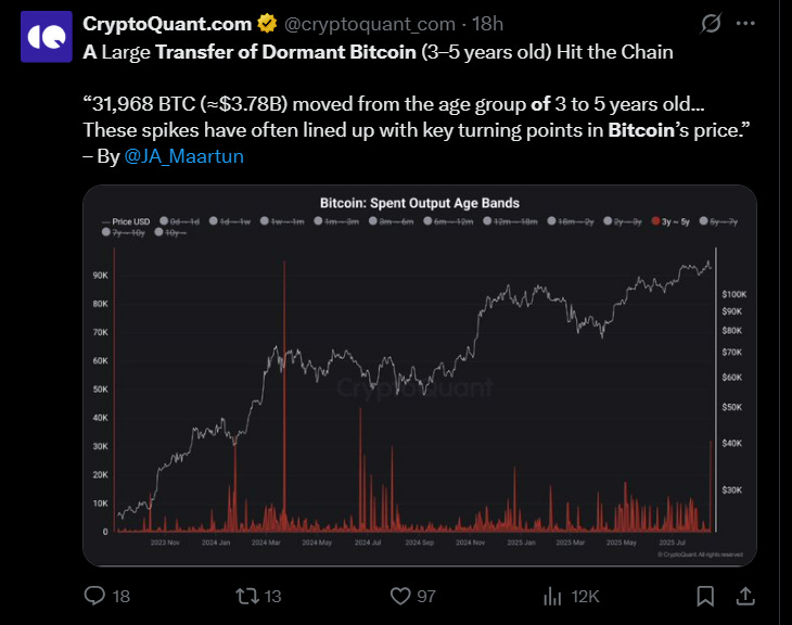 Le Bitcoin a rebaissé vers les plus bas de la semaine après sa tentative d'atteindre le niveau de 117 000 $ hier. Un transfert de près de 32 000 Bitcoins a été rapporté, un événement qui coïncide souvent avec des points de retournement majeurs du marché. C'est une situa…