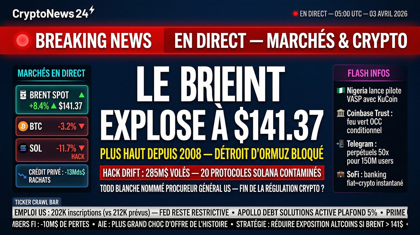 Nous naviguons entre deux eaux : une adoption institutionnelle qui s’accélère (SoFi, Coinbase Trust) et une macroéconomie qui s’assombrit (pétrole à 141 $). La nomination de Todd Blanche est un signal “bullish” pour la liberté d’innover aux USA, mais la crise énergétique reste le juge de paix pour les prix à court terme.