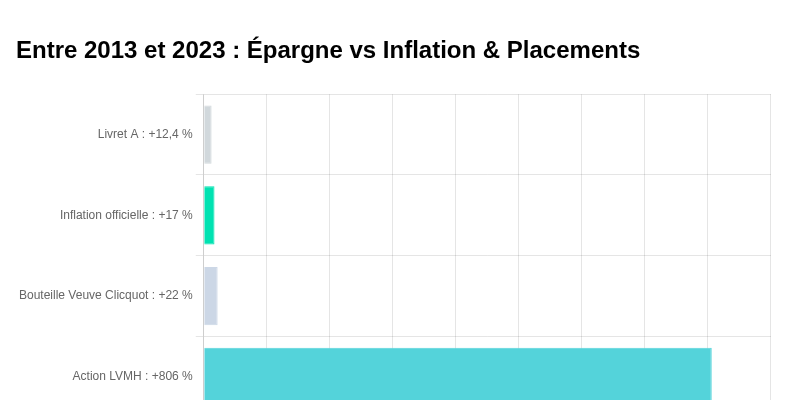 Sur la même période, l’inflation officielle a atteint 17 %. Concrètement, une bouteille de Veuve Clicquot valait 36 € en 2013 et 44 € en 2023, soit une hausse de plus de 20 %. Résultat : le pouvoir d’achat de l’épargne placée sur le Livret A a fondu. En termes réels, le capital a perdu au moins 5 % de sa valeur. Cette perte de capital invisible est le piège classique de l’épargne « sage » face à l’érosion monétaire.
