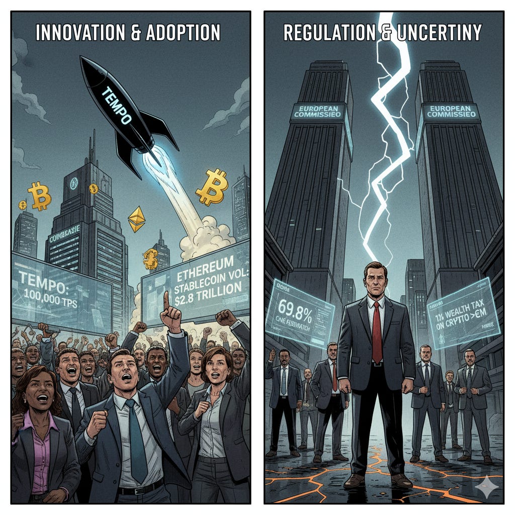 Le paysage crypto est en pleine effervescence : l’innovation continue de propulser de nouvelles infrastructures (Tempo de Stripe), tandis que la régulation se durcit en Europe (surveillance unifiée) et en France (taxe sur la richesse crypto). Les stablecoins battent des records de volume, et la participation institutionnelle remodèle le marché.